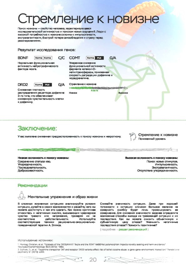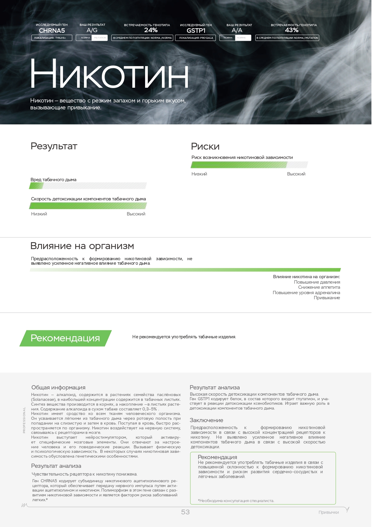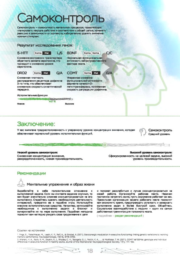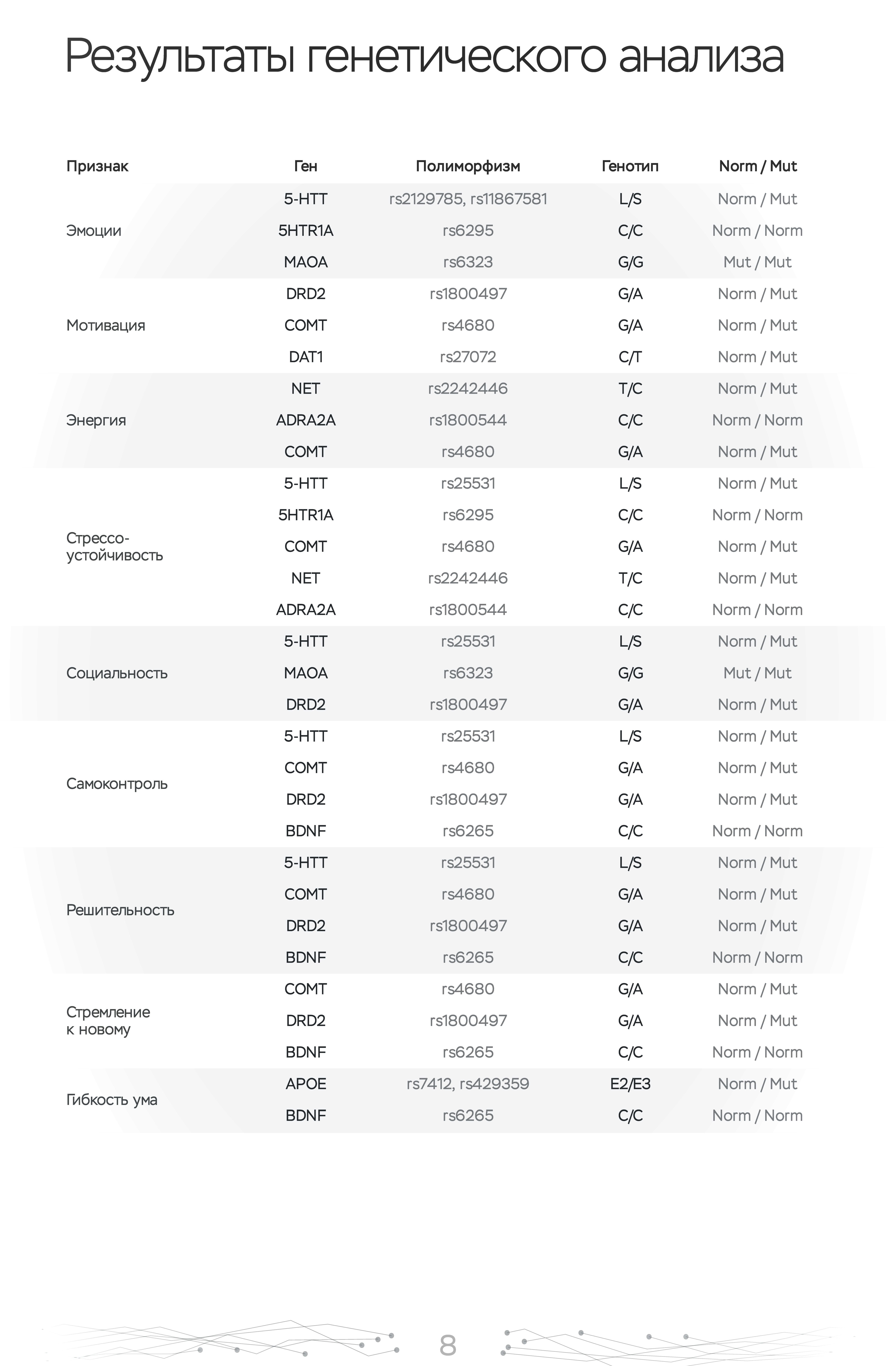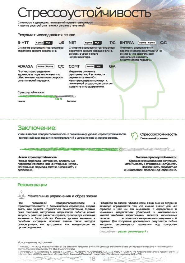 Этот ДНК анализ показывает влияние наиболее важных 10 генов на психическое и эмоциональное состояние. Именно они регулируют выработку гормонов, работу нейромедиаторов. Используйте знания о природных свойствах своего организма для борьбы со стрессом, повышения работоспособности и общего тонуса. Каждый человек индивидуален, поэтому мы рекомендуем пройти наш генетический нейро тест в Ростове.